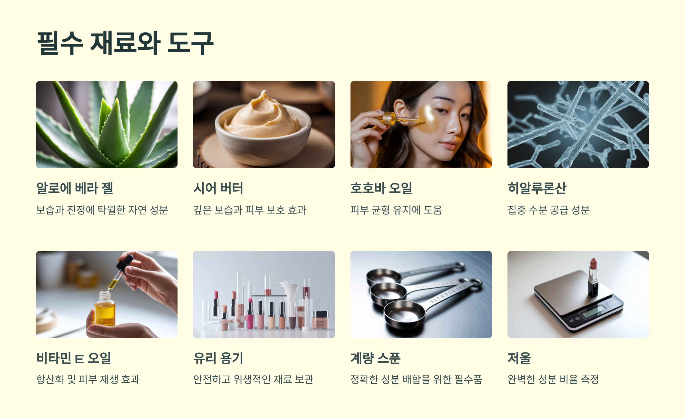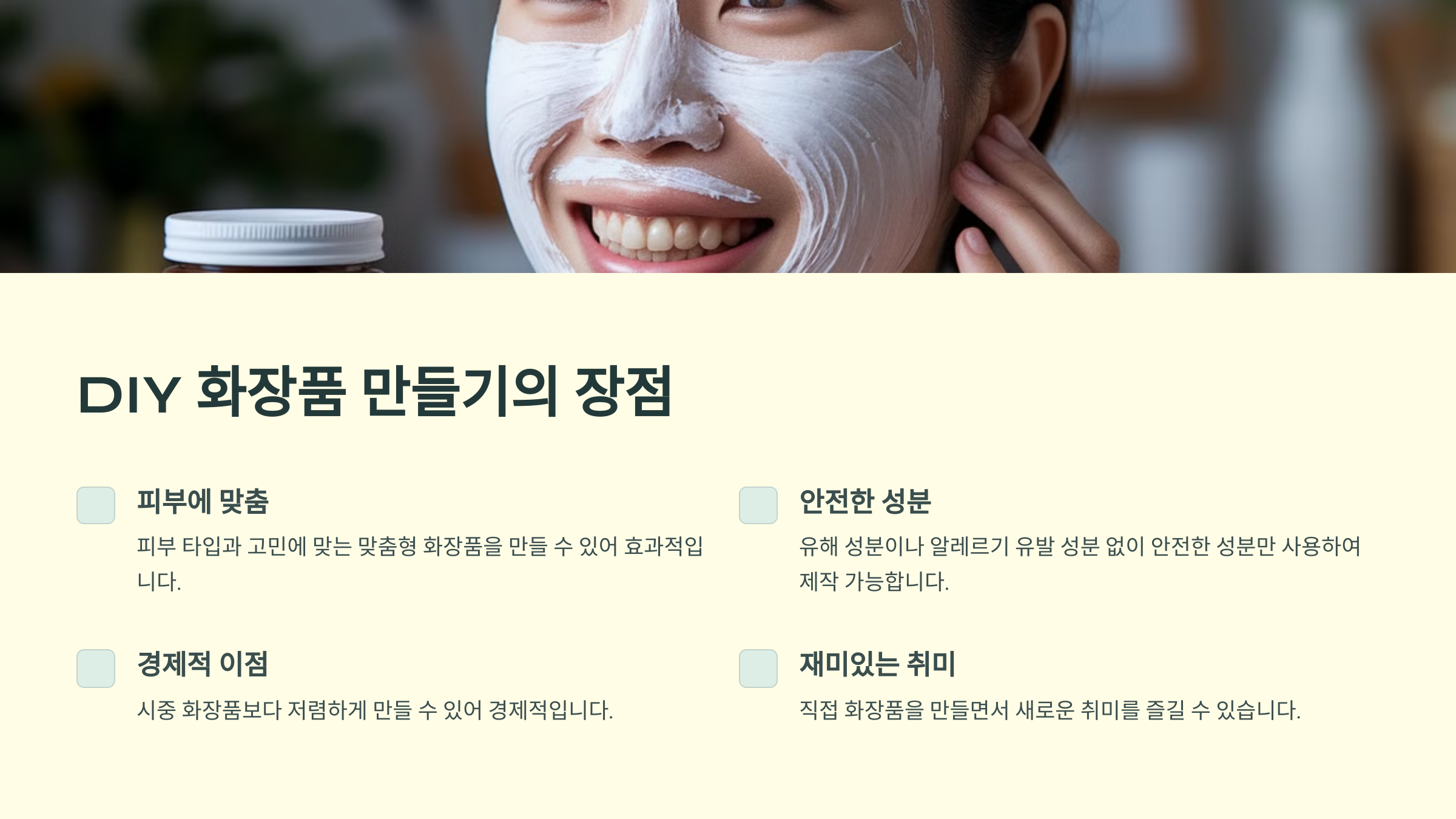 직접 화장품을 만들어 사용하는 DIY 화장품은 자신에게 맞는 성분을 조합해 사용할 수 있는 큰 장점이 있어요. 유해 성분을 걱정하지 않아도 되고, 피부 고민에 맞춰 조절할 수 있는 점도 매력적이에요.